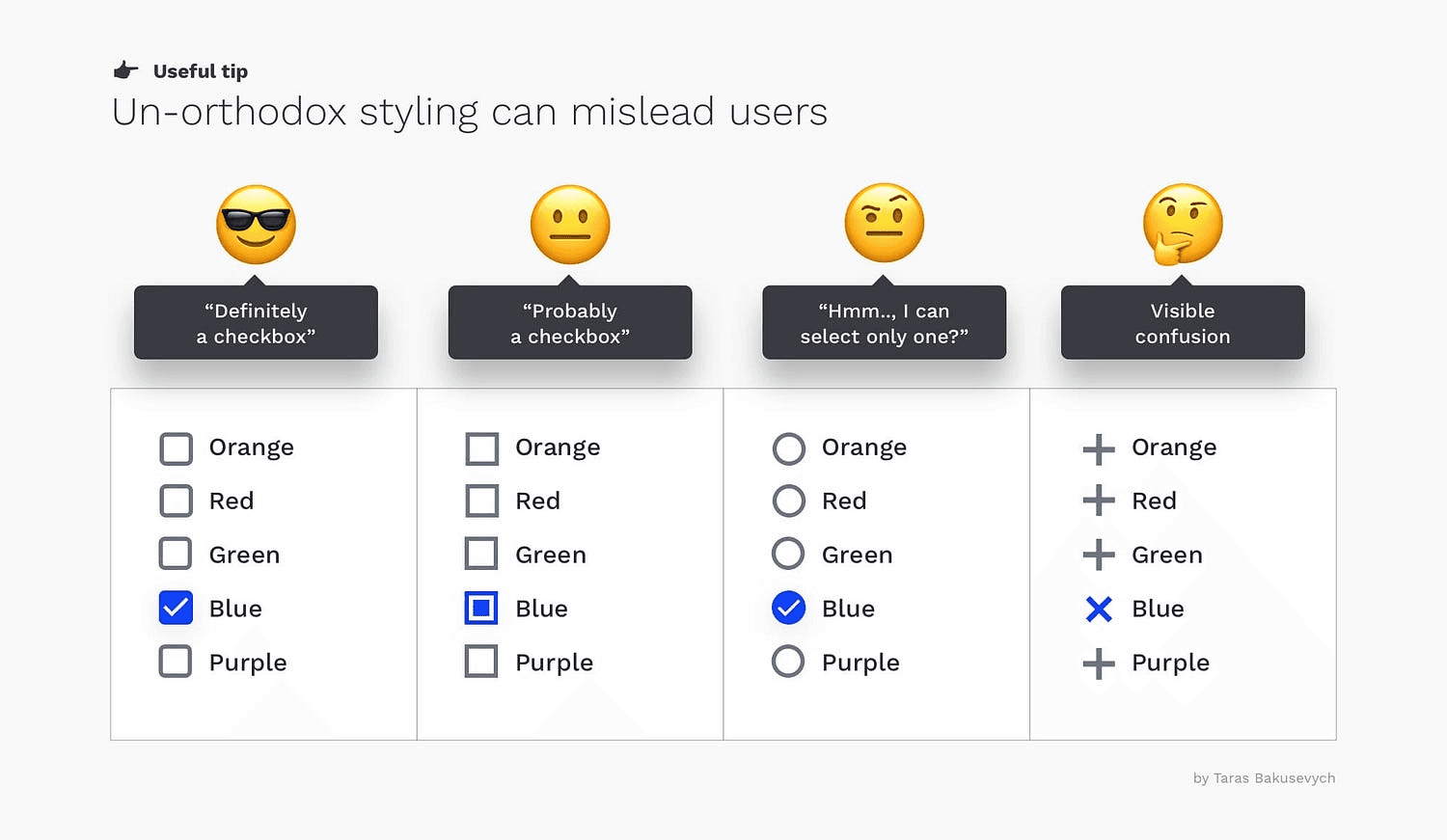 任何设计平台标准的偏差都会给用户增加额外的认知负担。经常看到容易与单选按钮混淆的圆形复选框。