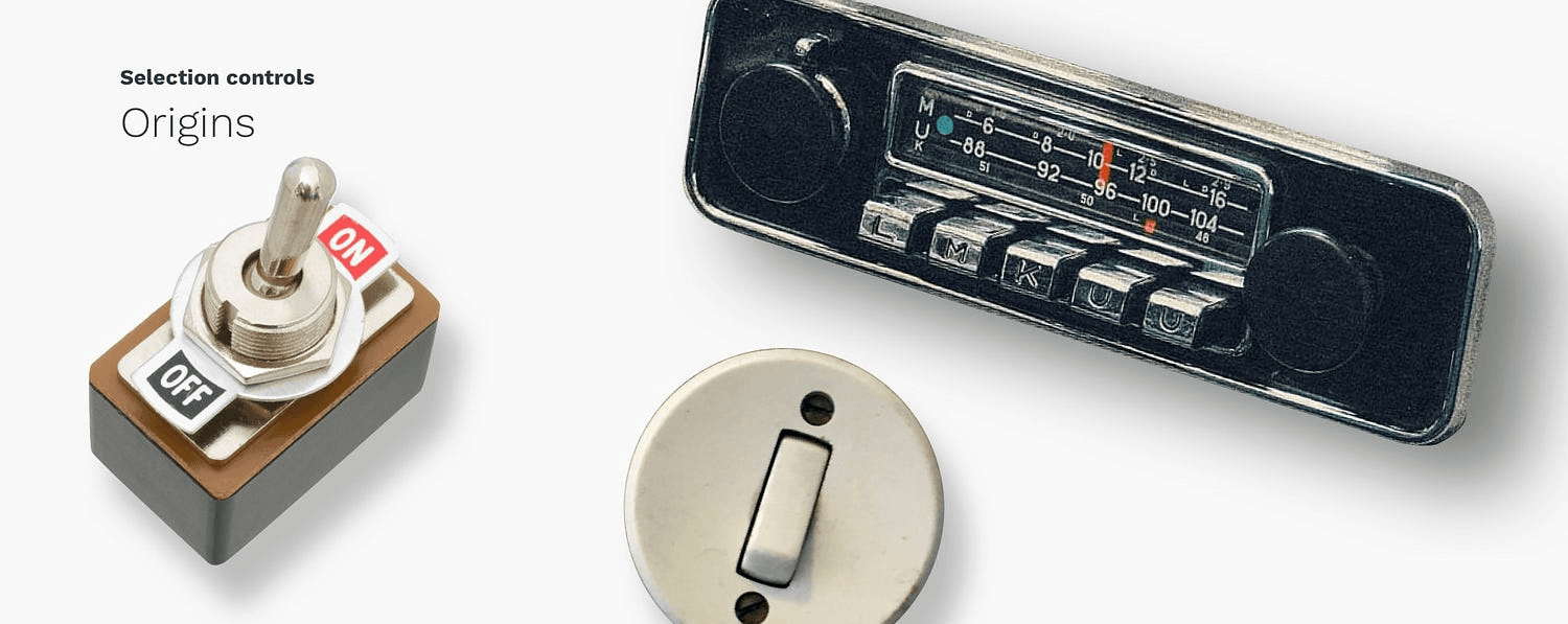 至于“Radio Buttons”,这个词来自汽车收音机,通常做法是在表盘下方有一组按钮,可以机械地存储电台预设,因此用户可以更快地在电台之间切换。按下其中一个按钮将导致它保持下降状态,直到按下另一个按钮。