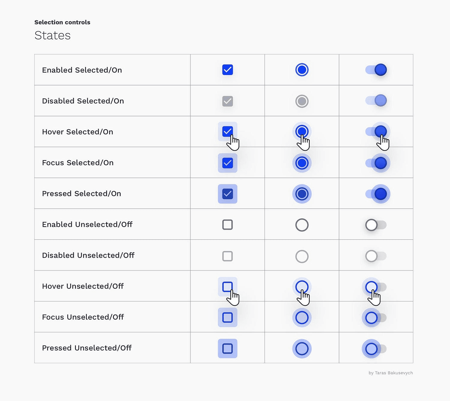 复选框和单选框可以选择或取消选择,开关可以是关闭或打开。它们都具有 启用enabled、禁用disabled、悬停hovered、获焦focused 和 按下pressed 状态。看起来很多,但创建所有这些状态以实现可靠的交互。